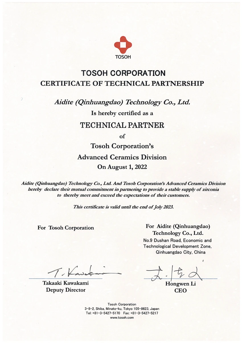 Aidite (Qinhuangdao) Technology Co., Ltd. và Bộ phận Gốm Kỹ thuật Tiên tiến của Tập đoàn Tosoh xin trân trọng tuyên bố cam kết hợp tác cùng nhau nhằm cung cấp ổn định nguồn nguyên liệu zirconia, qua đó đáp ứng và vượt trên sự mong đợi của khách hàng.